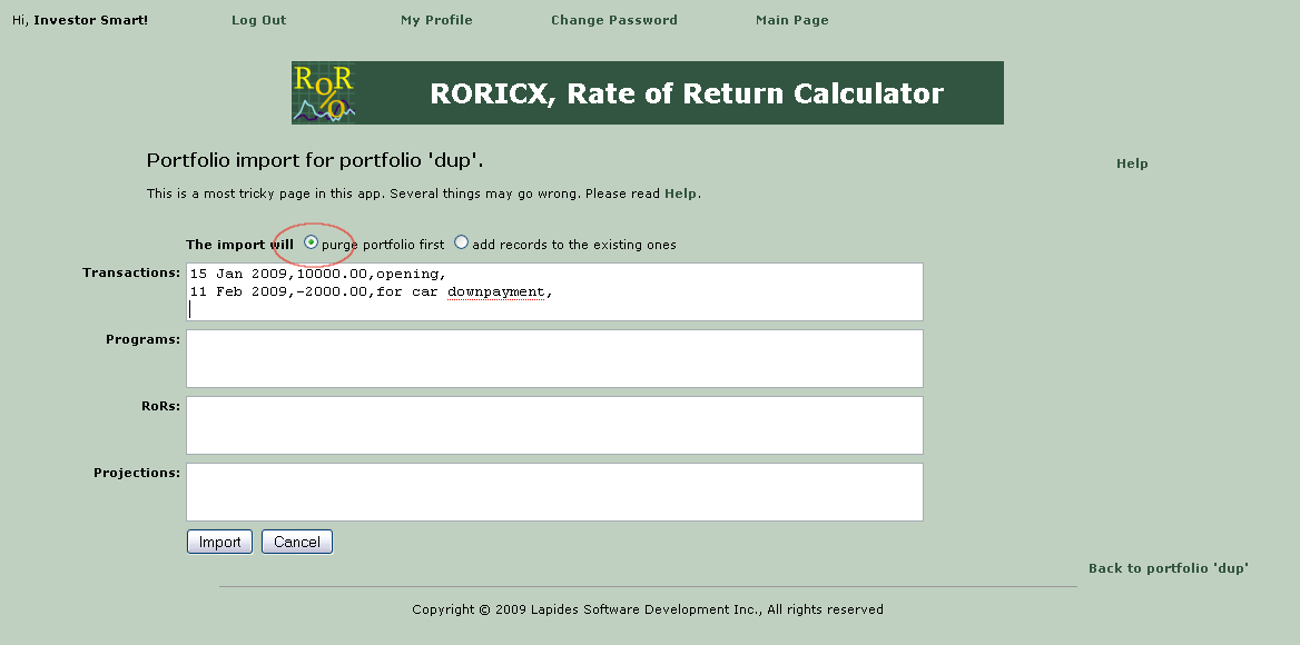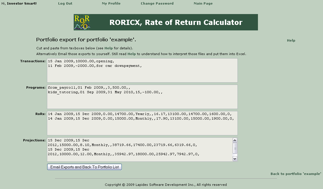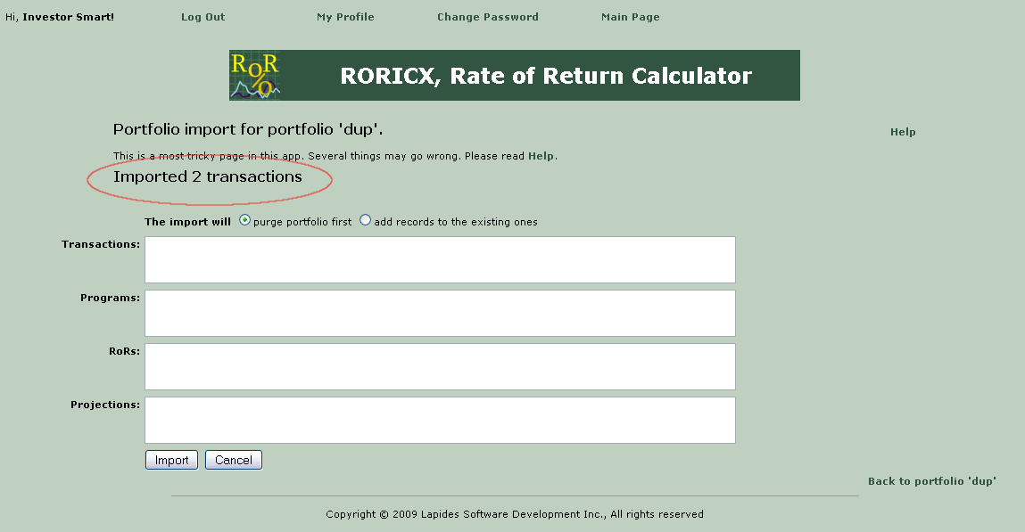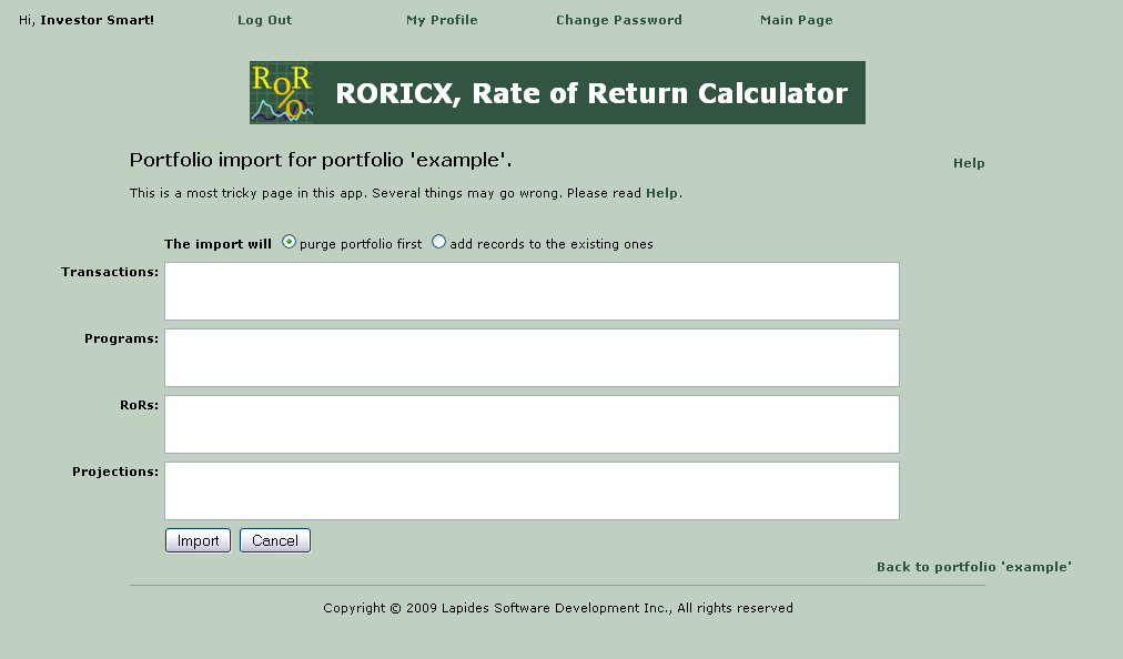 Each textarea contains the appropriate records from RORICX internal database. Transaction text box contains all transaction records that belong to portfolio, programs textarea contains all programs, RoRs textarea contains all RoRs calculations and projections textarea contains all projection calculations.