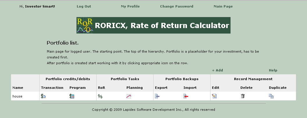 Once portfolio is created or selected the user starts to work with it. The user can drill down to transactions, programs, RoRs, projections or the user can execute export or import of the portfolio. All those tasks are executed by clicking appropriate icon on the row from the list. It is important to understand that all transactions, programs, RoRs and projections belong to one particular portfolio. Those are not visible from different portfolios.