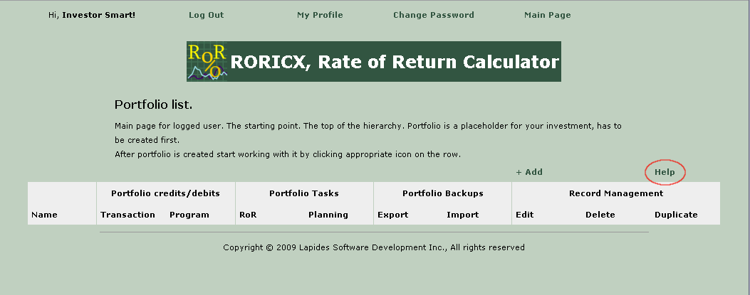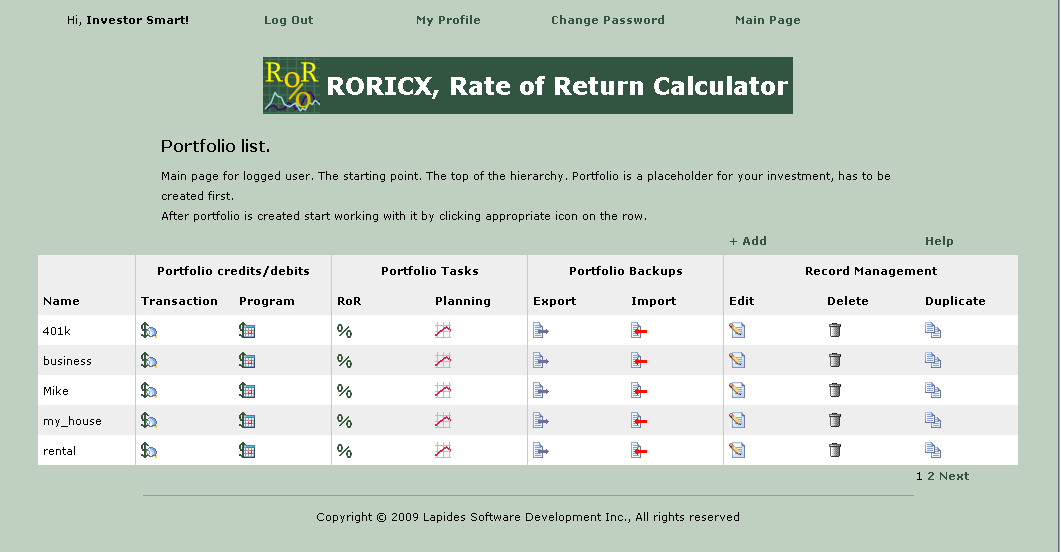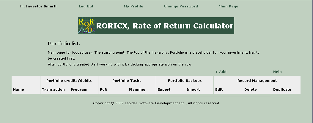 Portfolio List Page is the Main page for logged user, the starting point, the top of the hierarchy. Portfolio itself is a placeholder for your investment. Everything in RORICX resides inside certain portfolio.