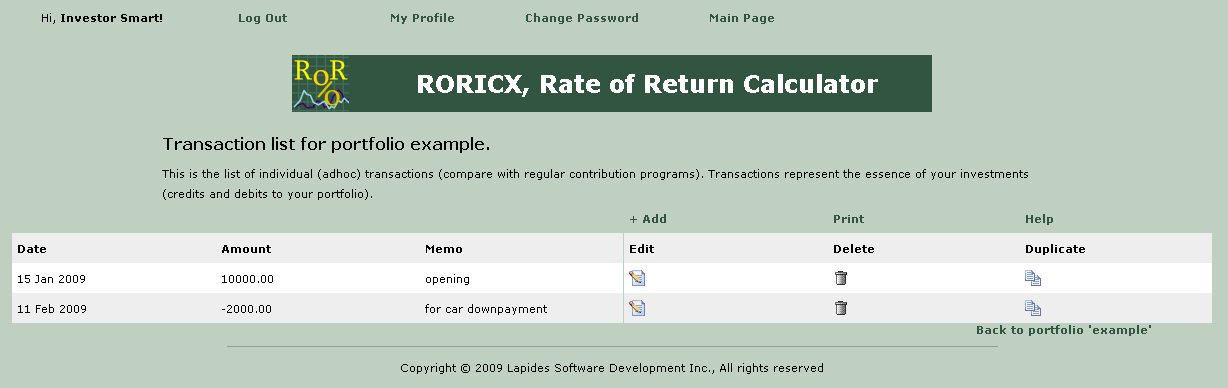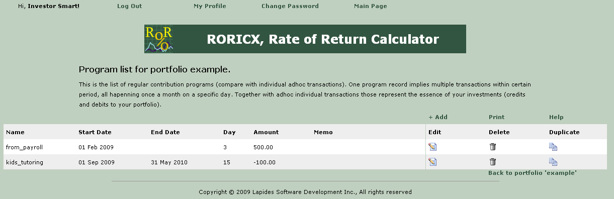 icon. The only possible thing to do on this screen is to type a unique name for the new portfolio copy. After clicking the Duplicate button the new portfolio with this name is created along with all the transactions, programs, RoR and Projection Calculations and the user is redirected back to the Portfolio List Page.
