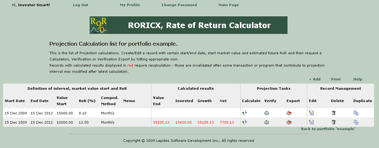 One last note to emphasize is the difference between Projection Calculation and RoR Calculation. In both cases three input parameters are the same: start and end dates of an interval and portfolio start market value. The fourths parameter is different. In case of Projection Calculation it is RoR and in case of RoR Calculation it is portfolio end market value. Accordingly the result of calculation is different, in case of RoR calculation we calculate RoR and in case of Projection Calculation we calculate portfolio end market value.