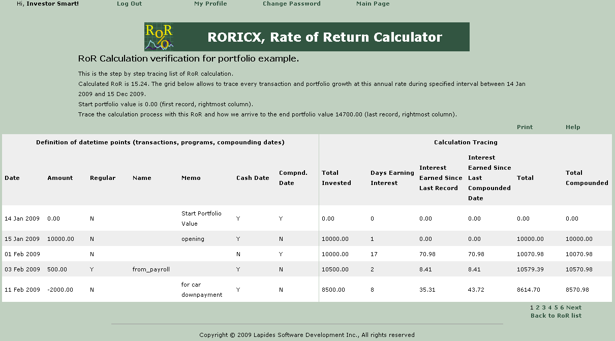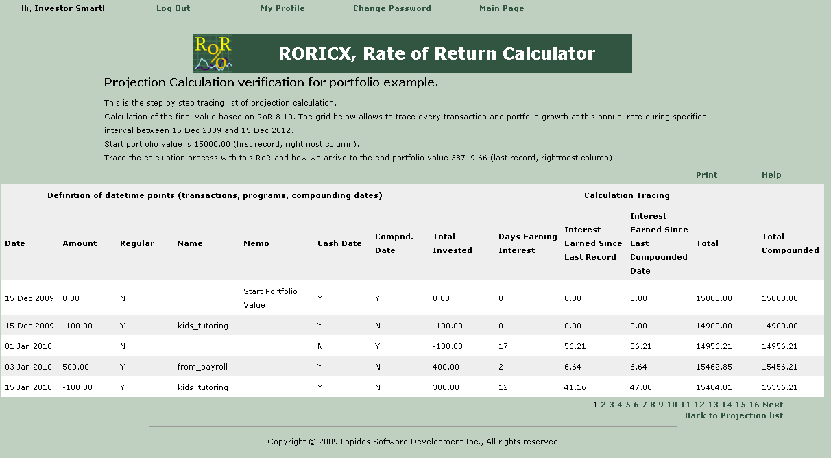 In the end we'll arrive to the last record and the Total Compounded should be equal (within the rounding of RoR) to the portfolio end market value that you had specified for this RoR calculation. I.e. if you increase or decrease RoR by 0.01 the end value will be further away than the one you were validating. If you want to check this, go to Planning Page, and enter the same Start/End dates, same Portfolio Start Market Value and three different RoRs (i.e. in this case 15.23 then 15.24 then 15.25) and obtain the End Values and compare those. |