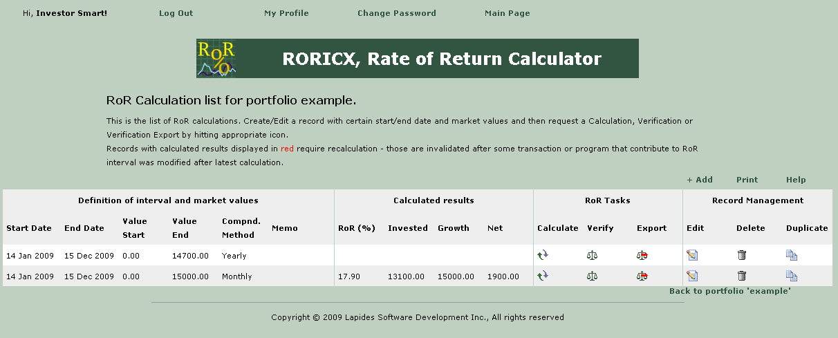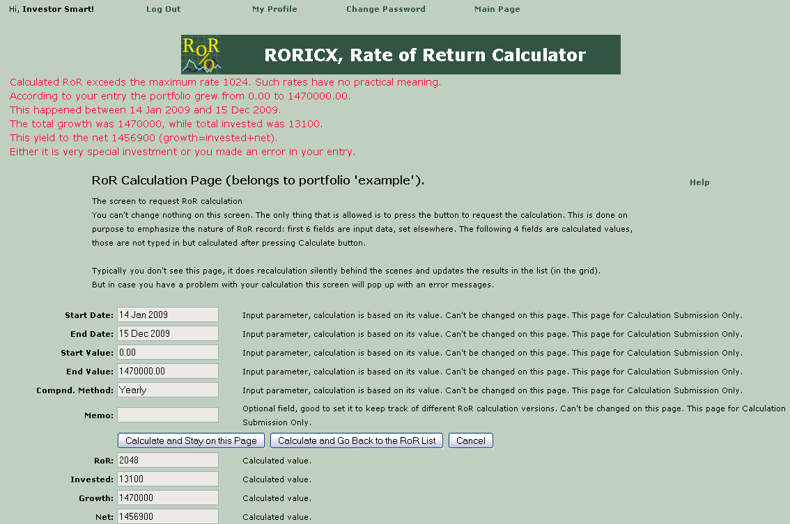 RoR Calculation List Page the calculation is requested and if the RoR is calculated without any problem the calculated results appear in the second section of columns. However if there is a problem this page is displayed with an error message. Consider for example the following scenario. Lets increase the end market value 100 times and click the